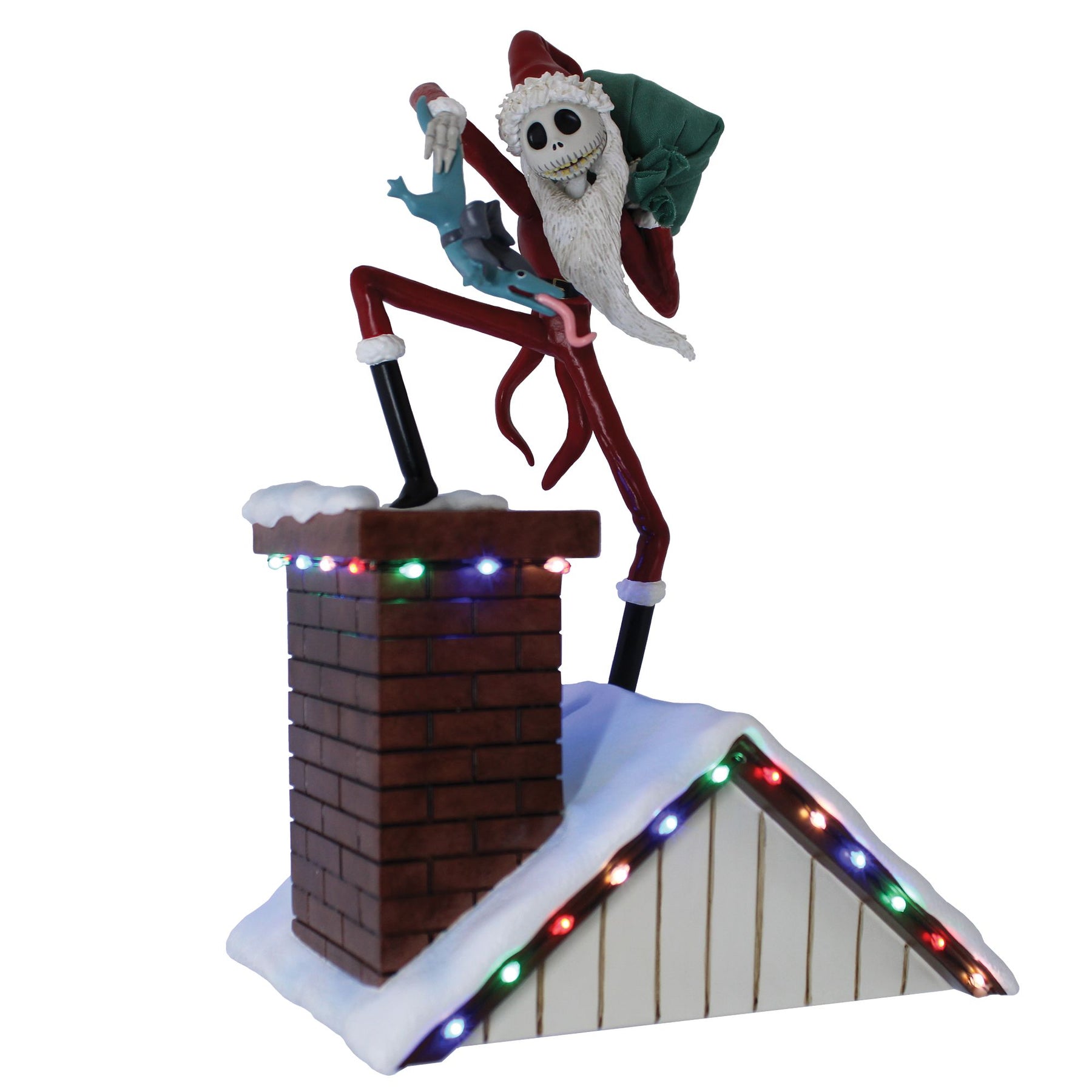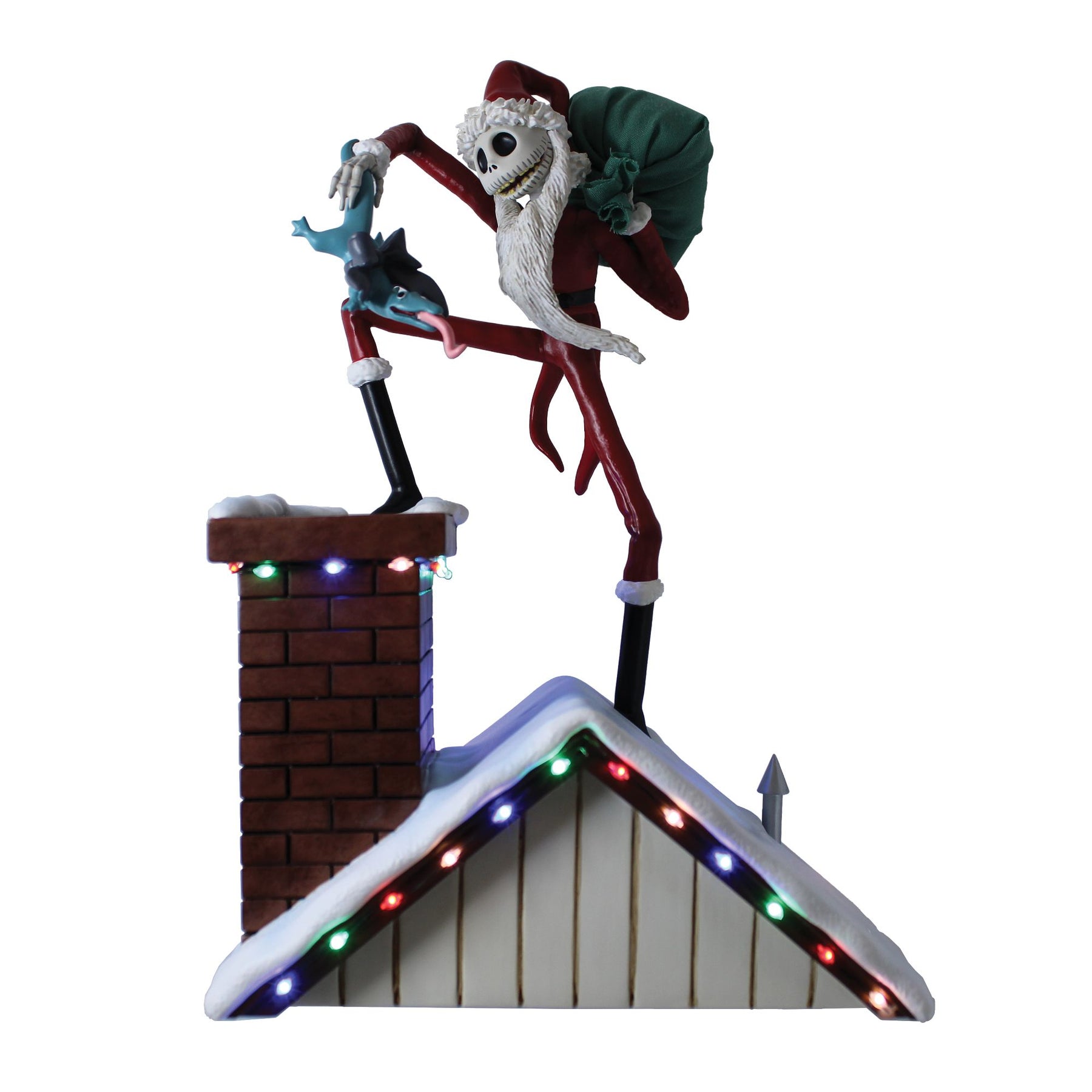 Santa Jack drops a little gift for Timmy down the chimney which is sure to delight with fright! Special details include a real fabric gift bag, glittery snow on the roof top and illuminated Christmas house lights!
