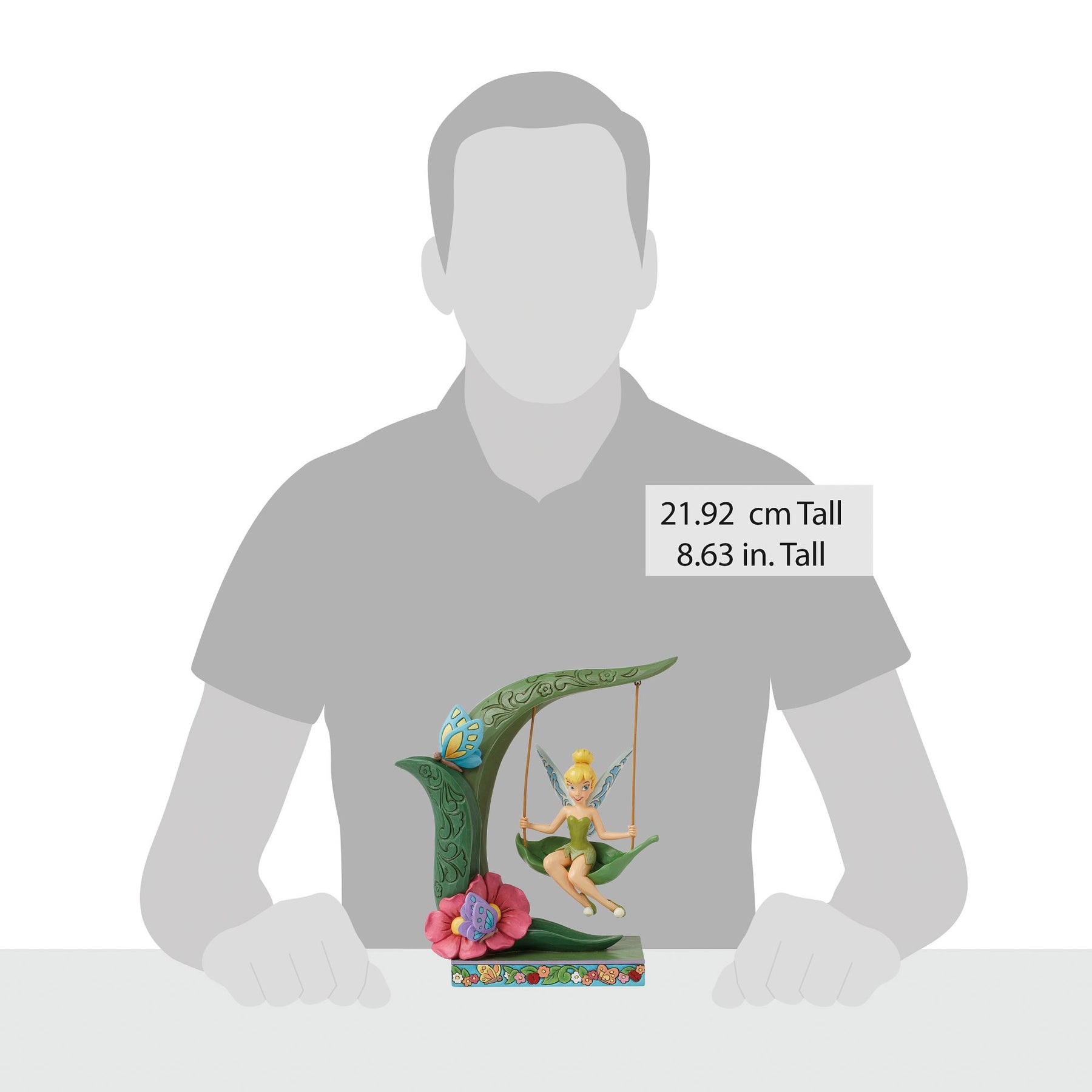 This colorful piece from beloved artist Jim Shore captures the whimsy of Disney's beloved fairy, Tinkerbell on a carefree spring day. Perched on a tree swing amidst colorful flowers, Tinkerbell smiles brightly in the beauty of nature.